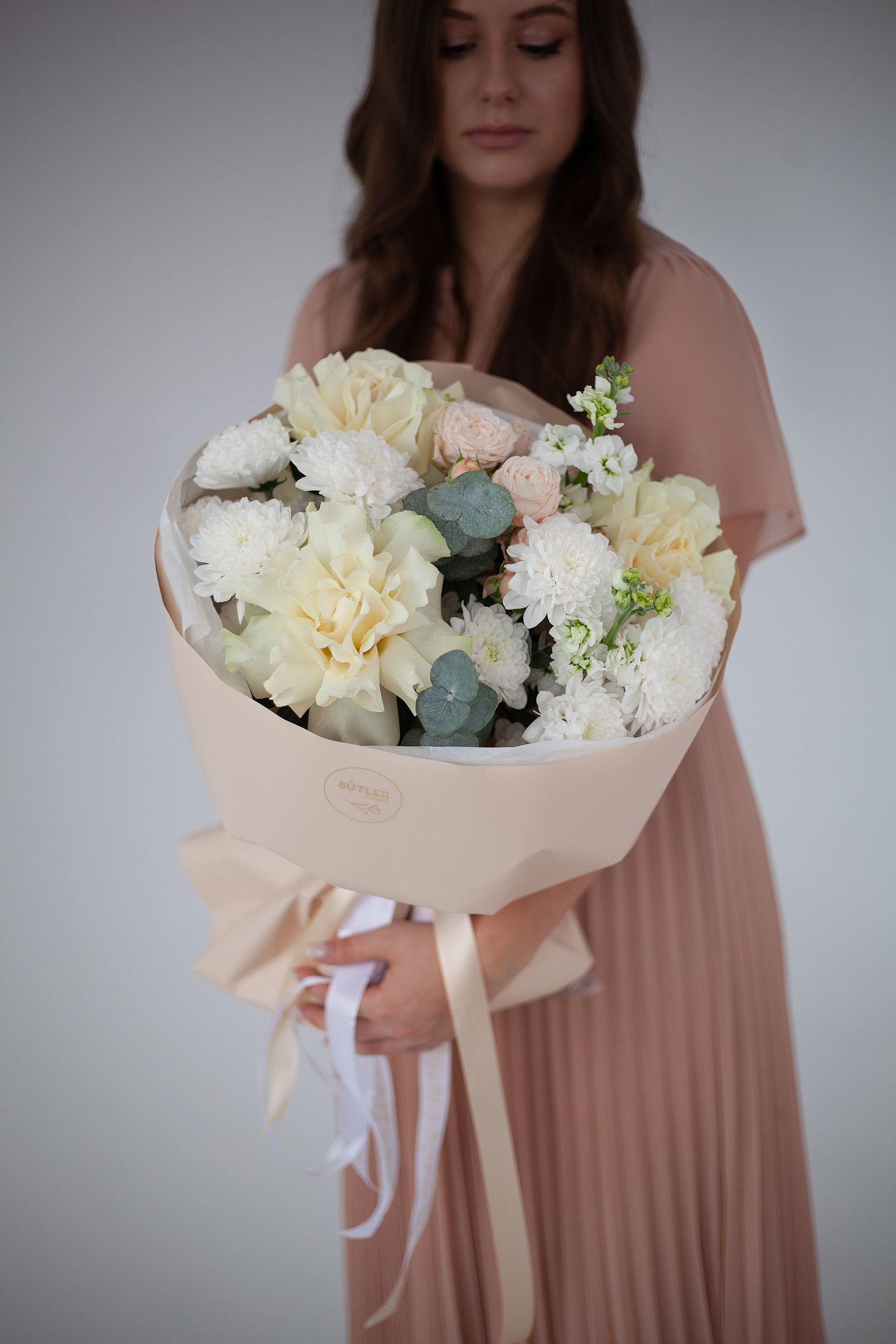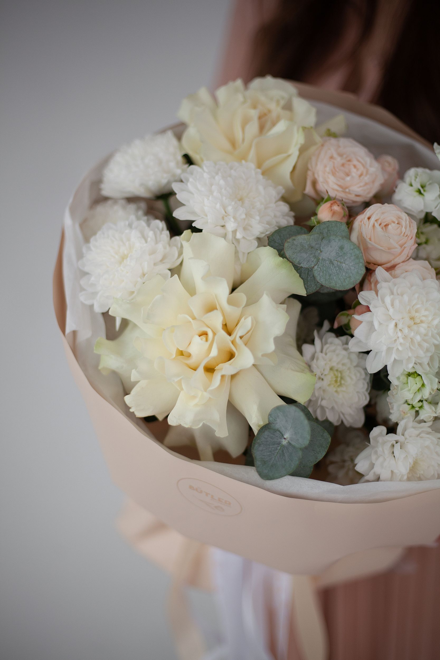 Хризантема кустовая - 2 шт. Кустовая роза - 1 шт. Упаковка дизайнерская - 1 шт. Французская роза - 3 шт.