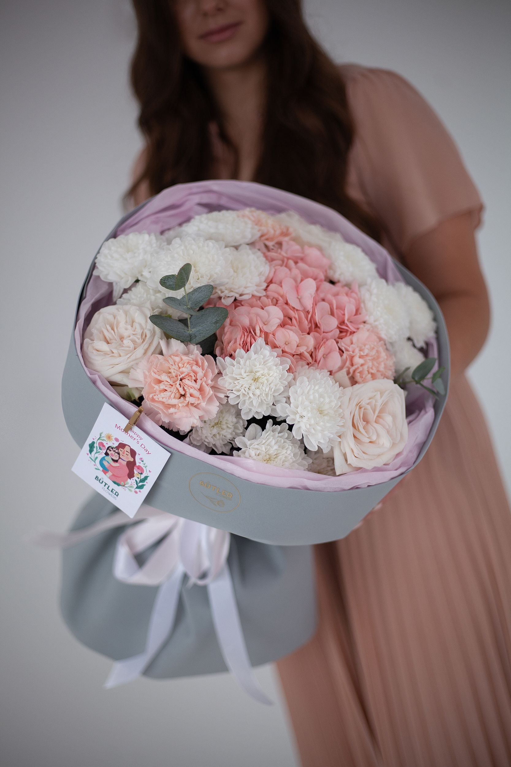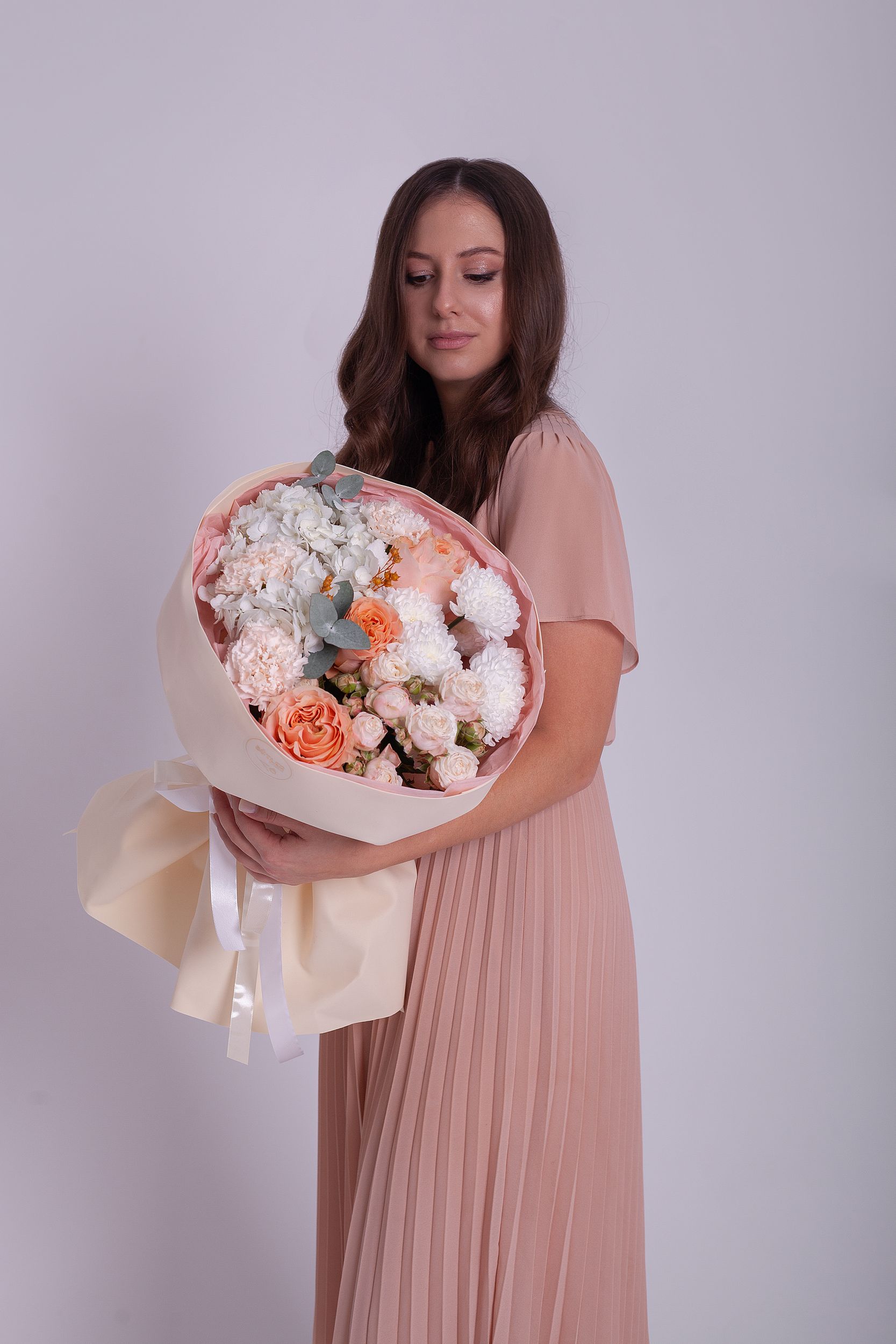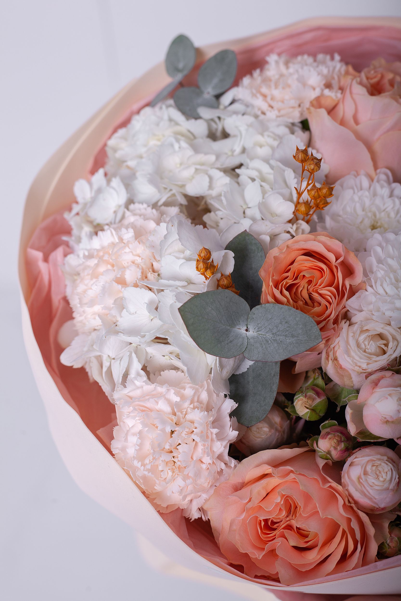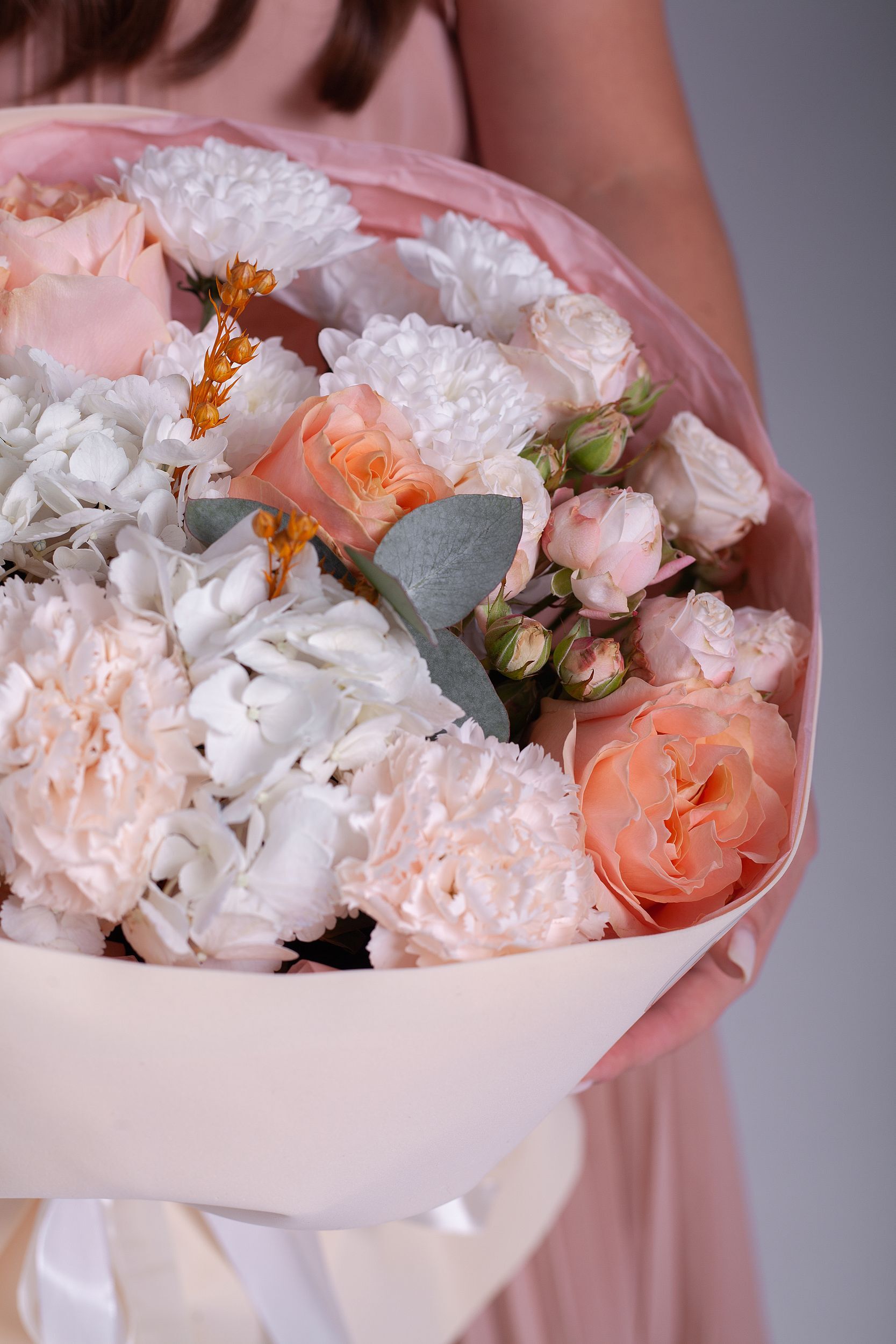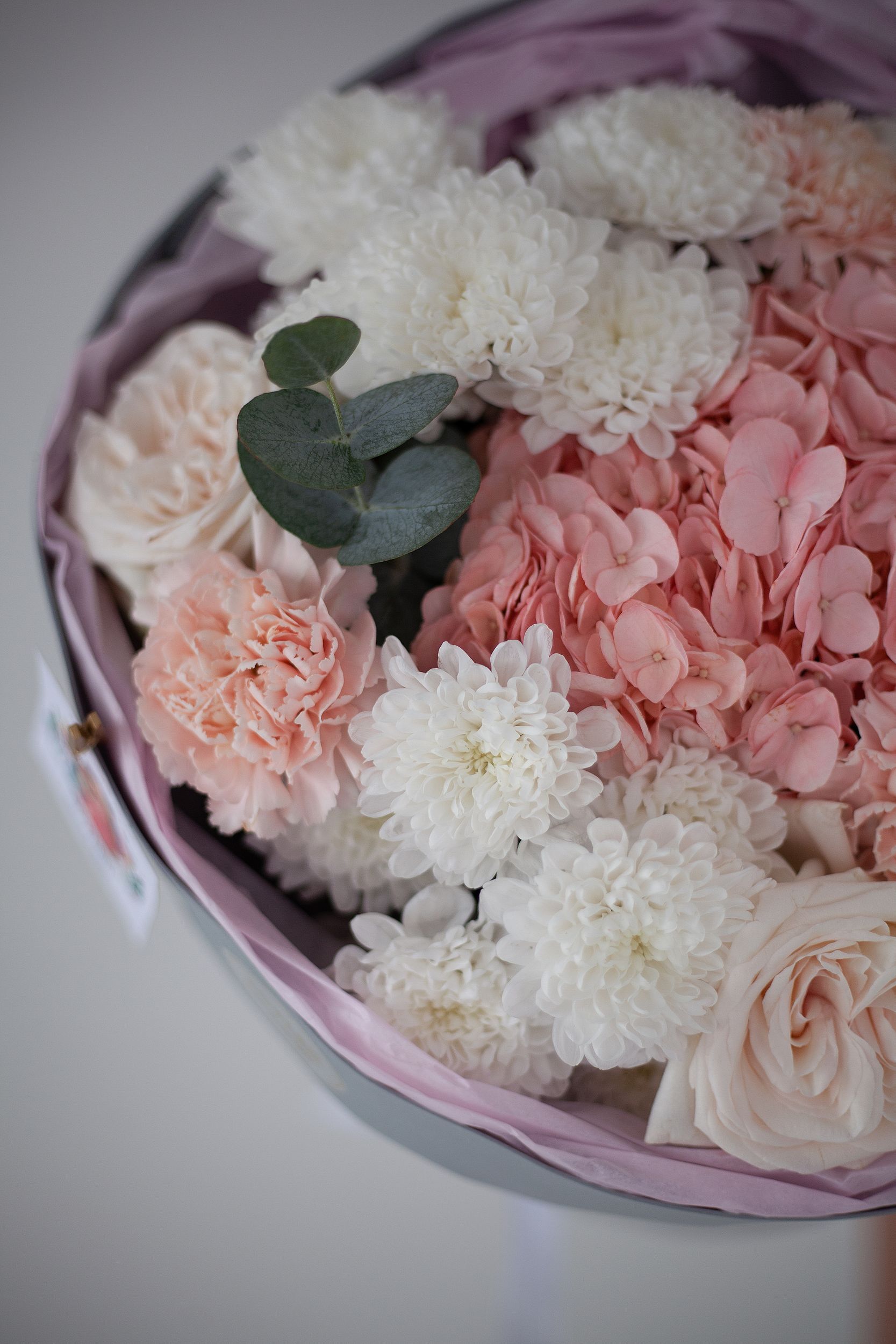 Гортензия, хризантема, роза, роза пионовидная, декор, упаковка