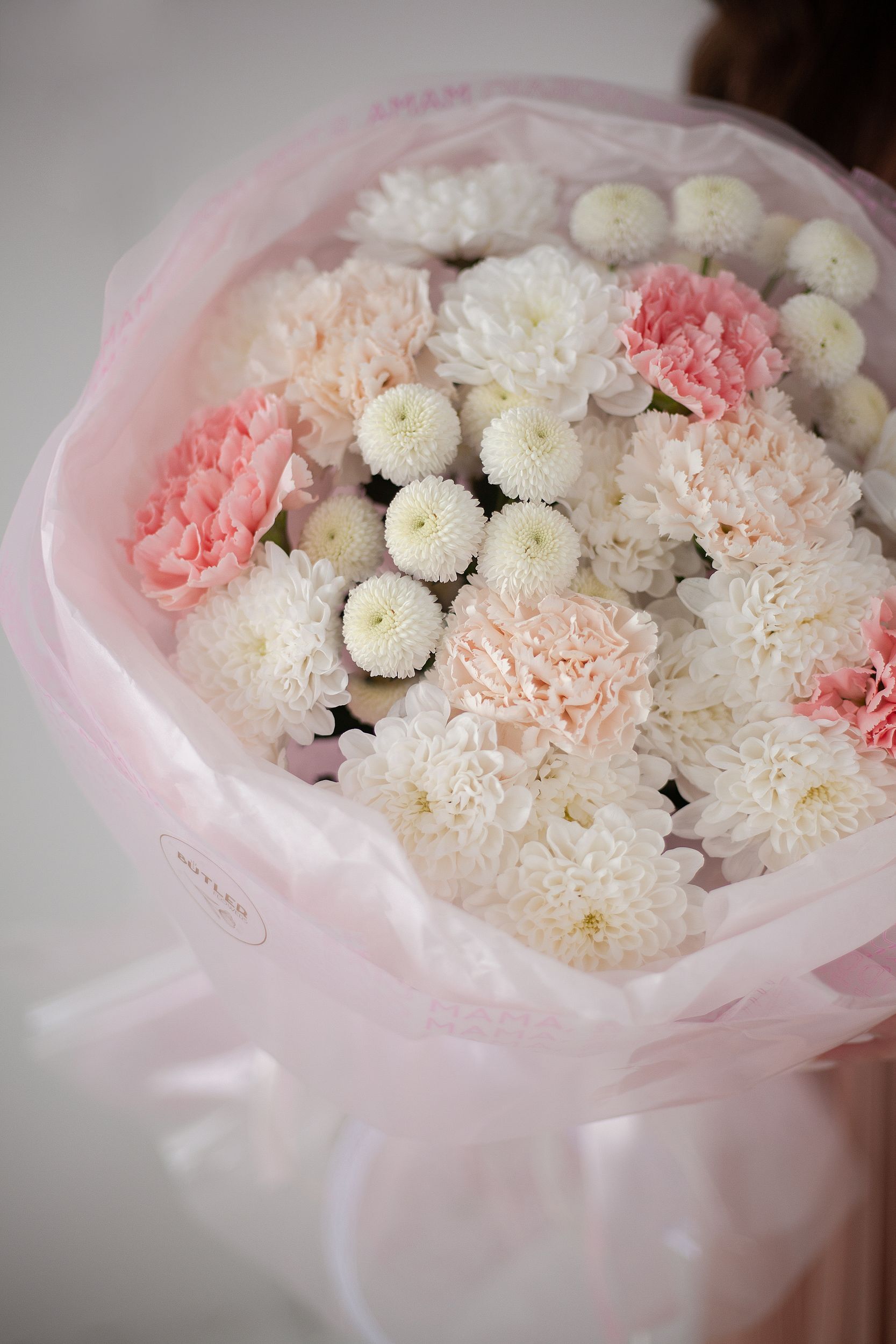 Роза кустовая - 1 шт. Хризантема кустовая - 1 шт. Диантус - 5 шт. Упаковка дизайнерская - 1 шт.