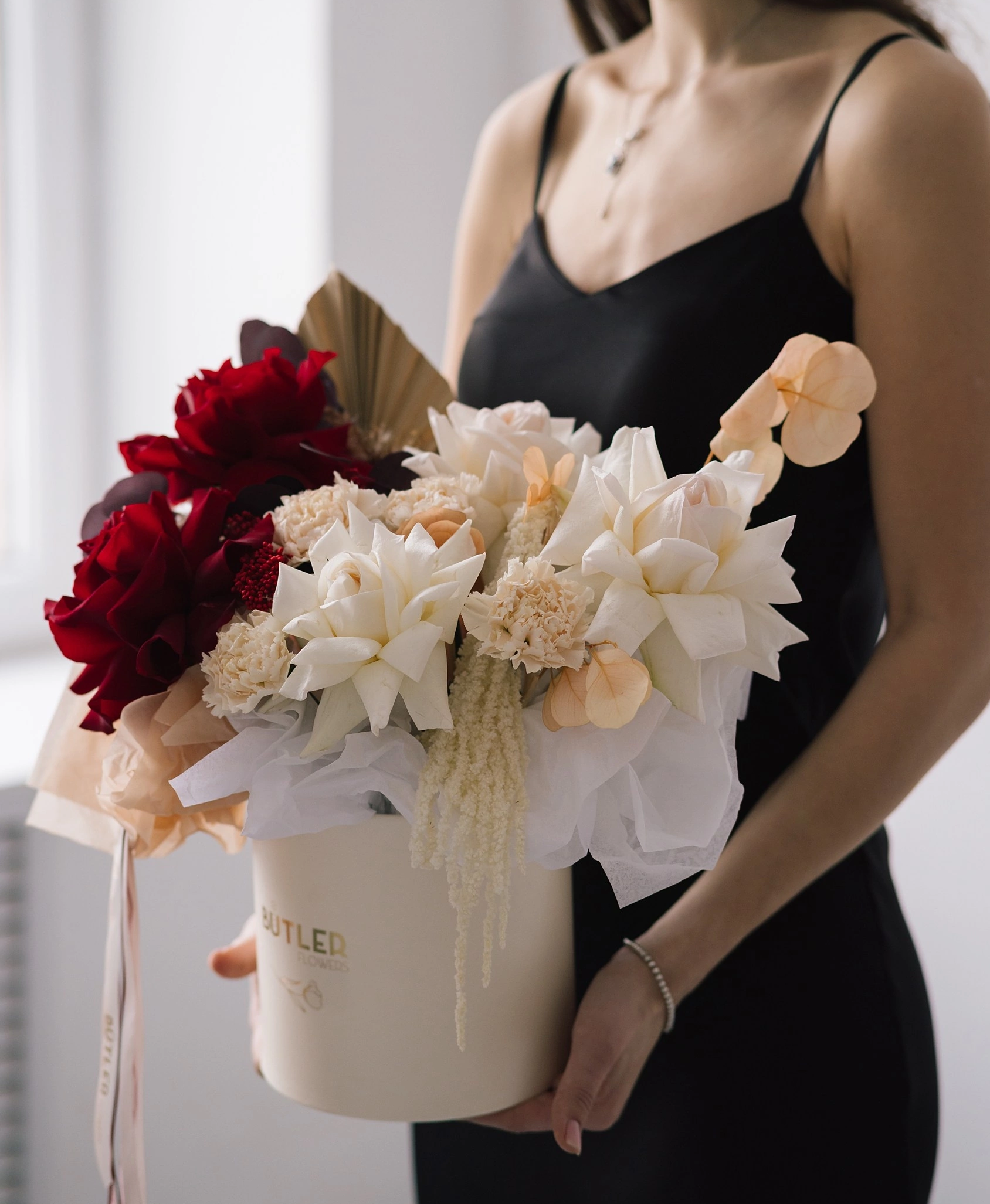 Красная роза, роза White Ohara, диантус, амарантус, эвкалипт, озотамнус.