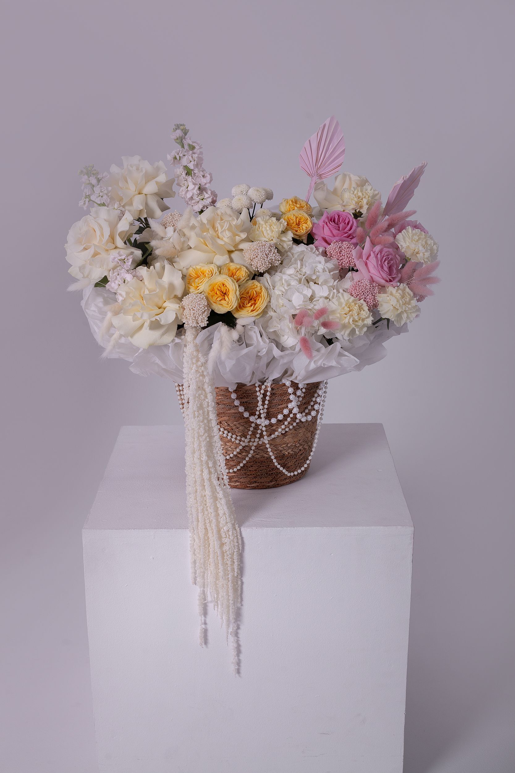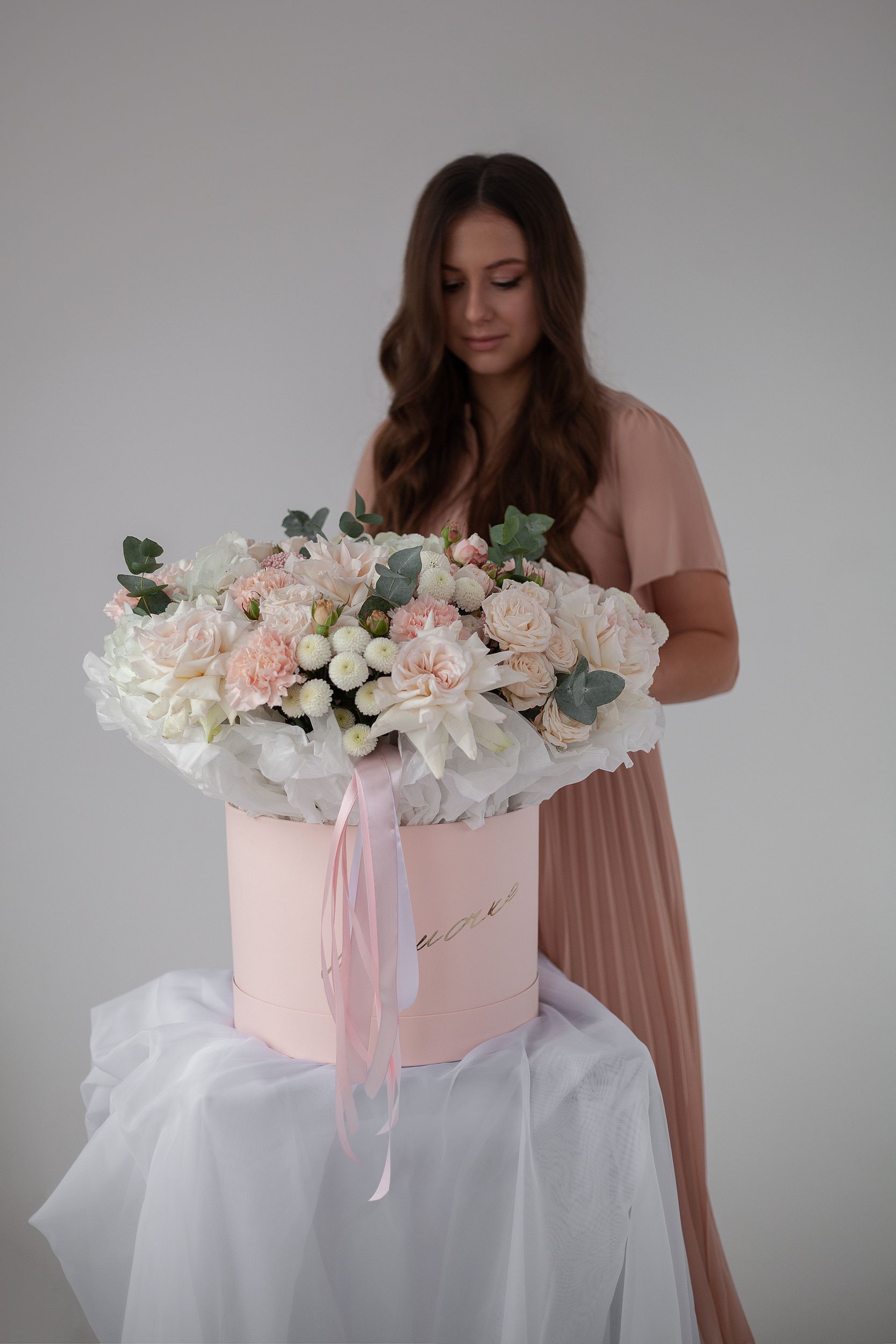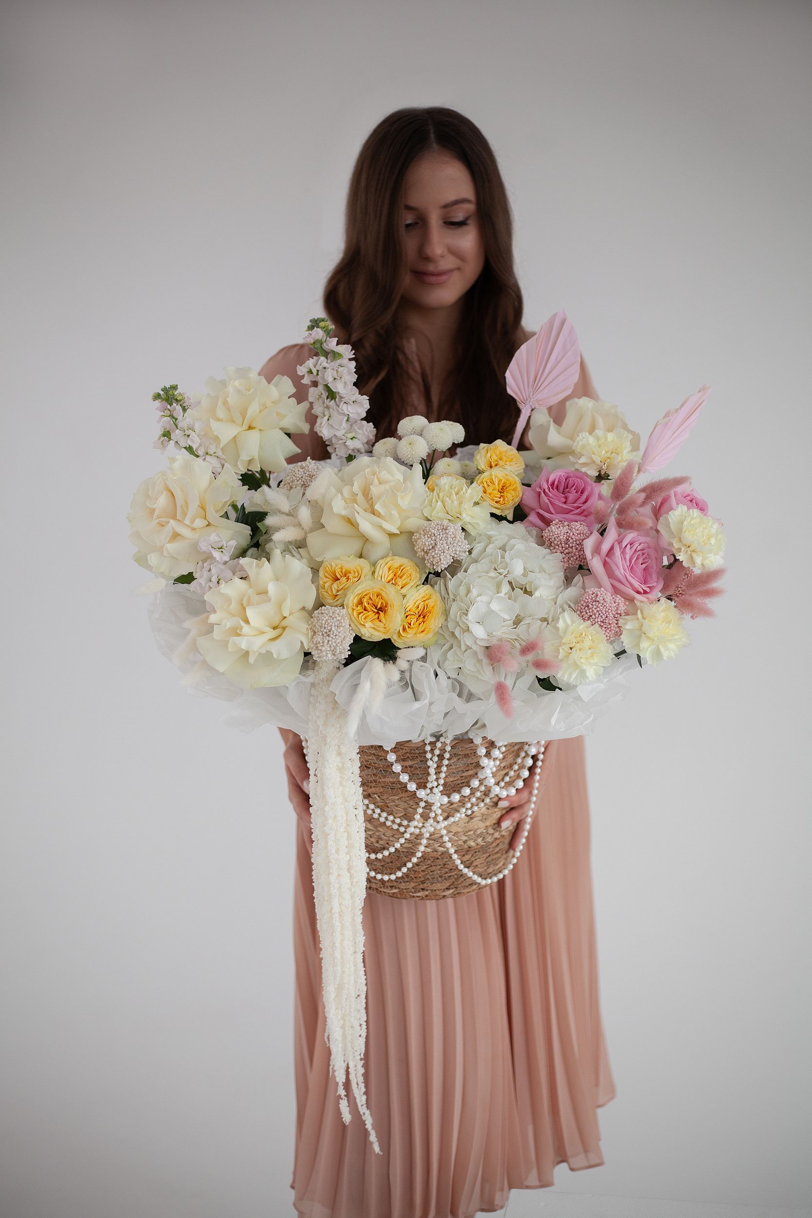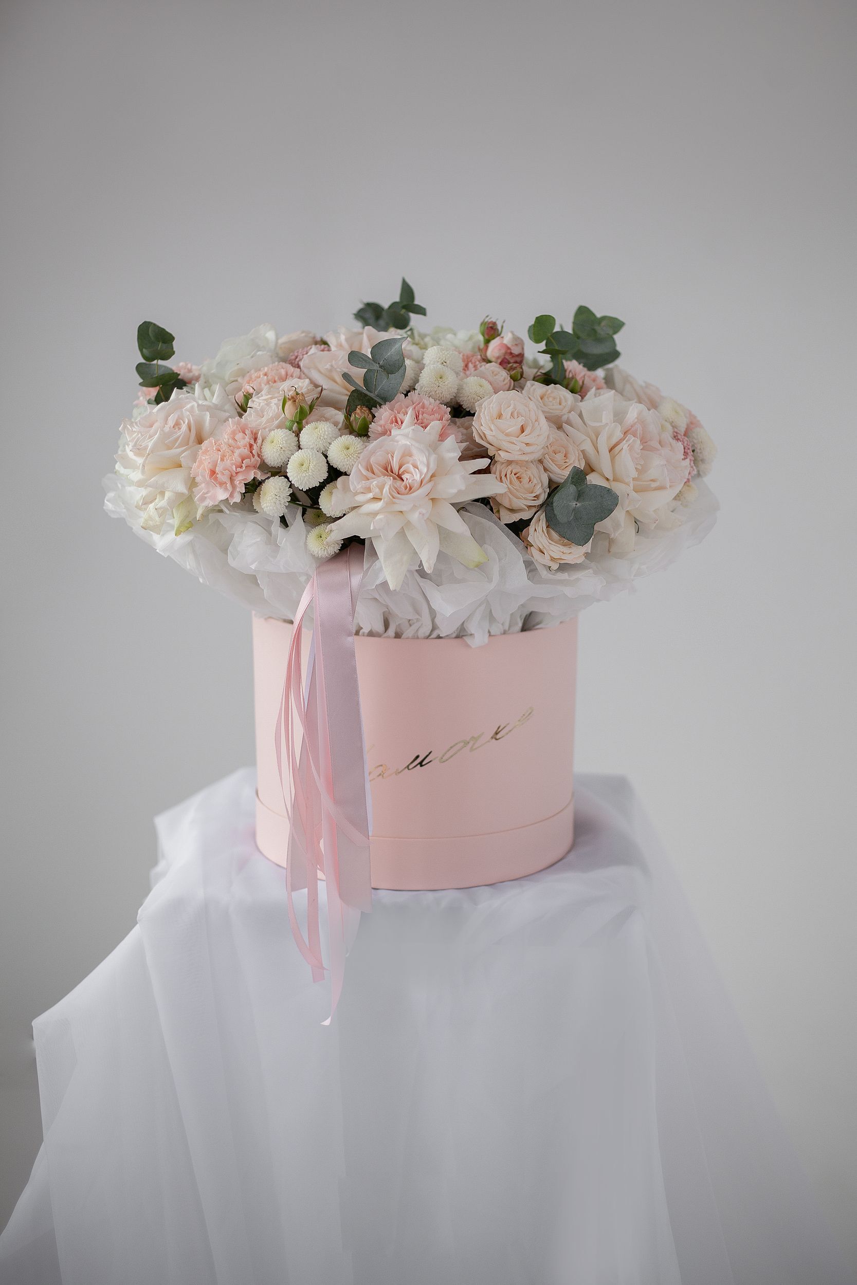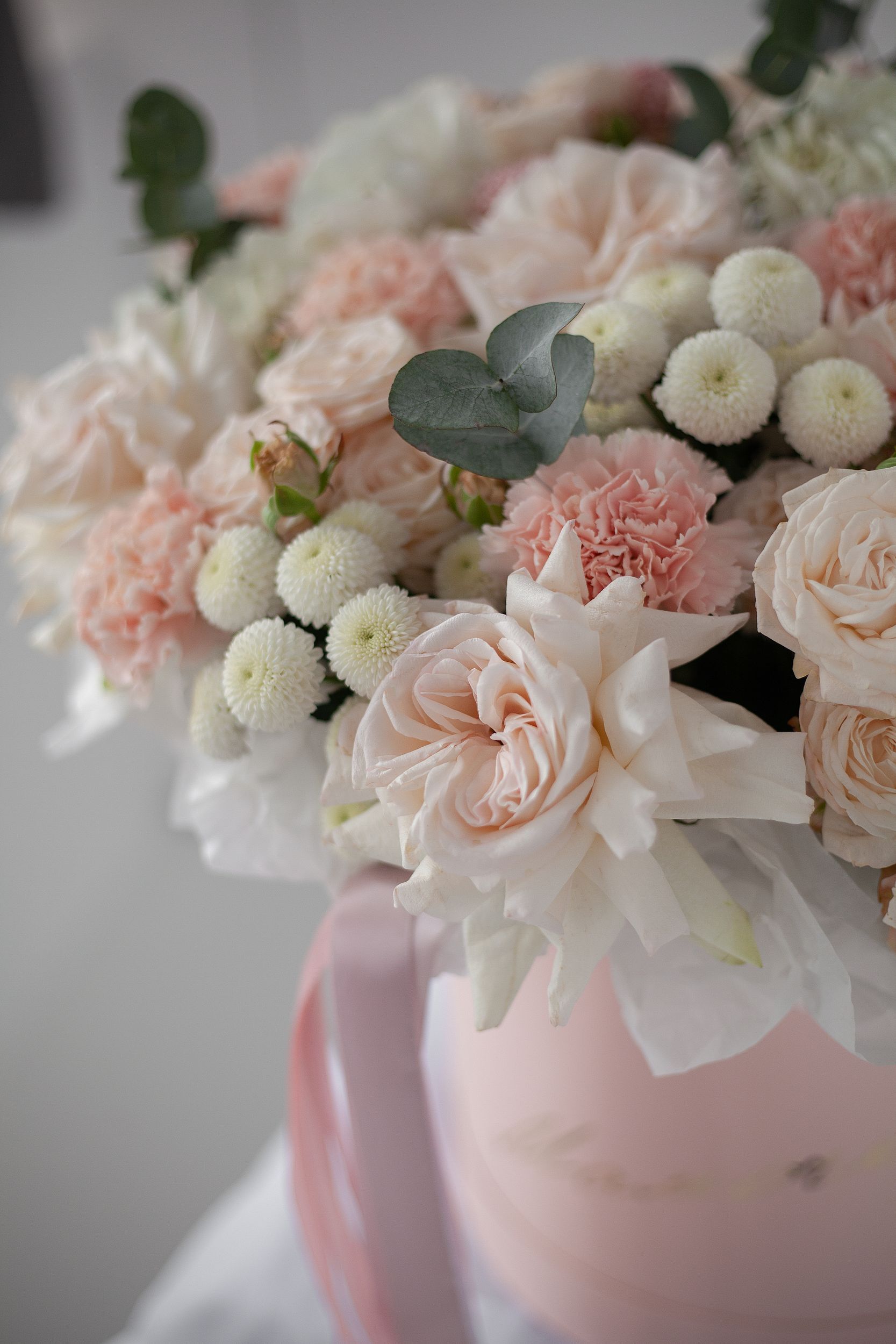 Гортензия 2, Роза pink 6, Гвоздика 4, Гвоздика 3, Хризантема 2, Роза Кэти 3, Роза мэнсфилд 1, Эустома 3.