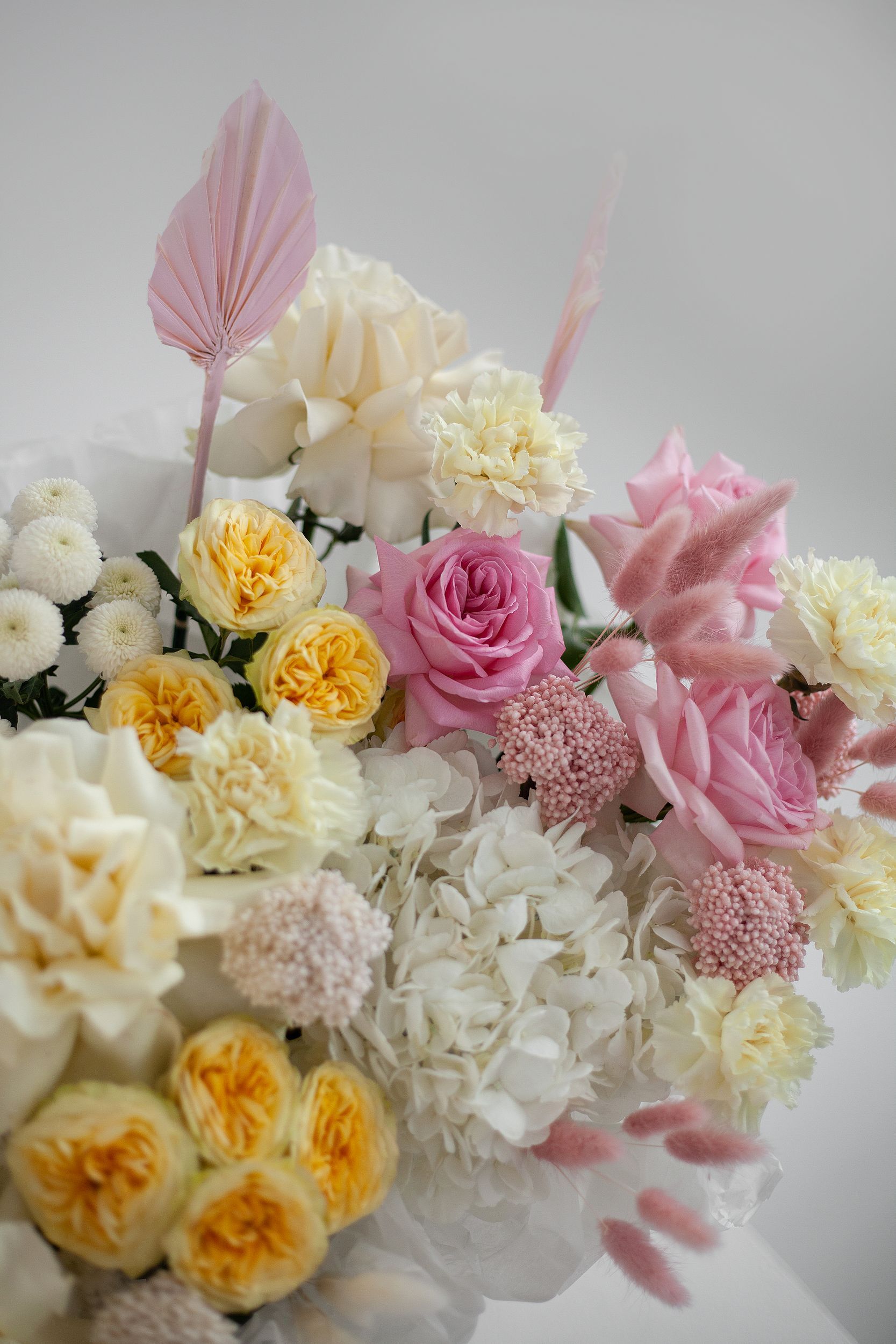 Кустовая роза, одноголовая роза, хризантема, диантус, гортензия.